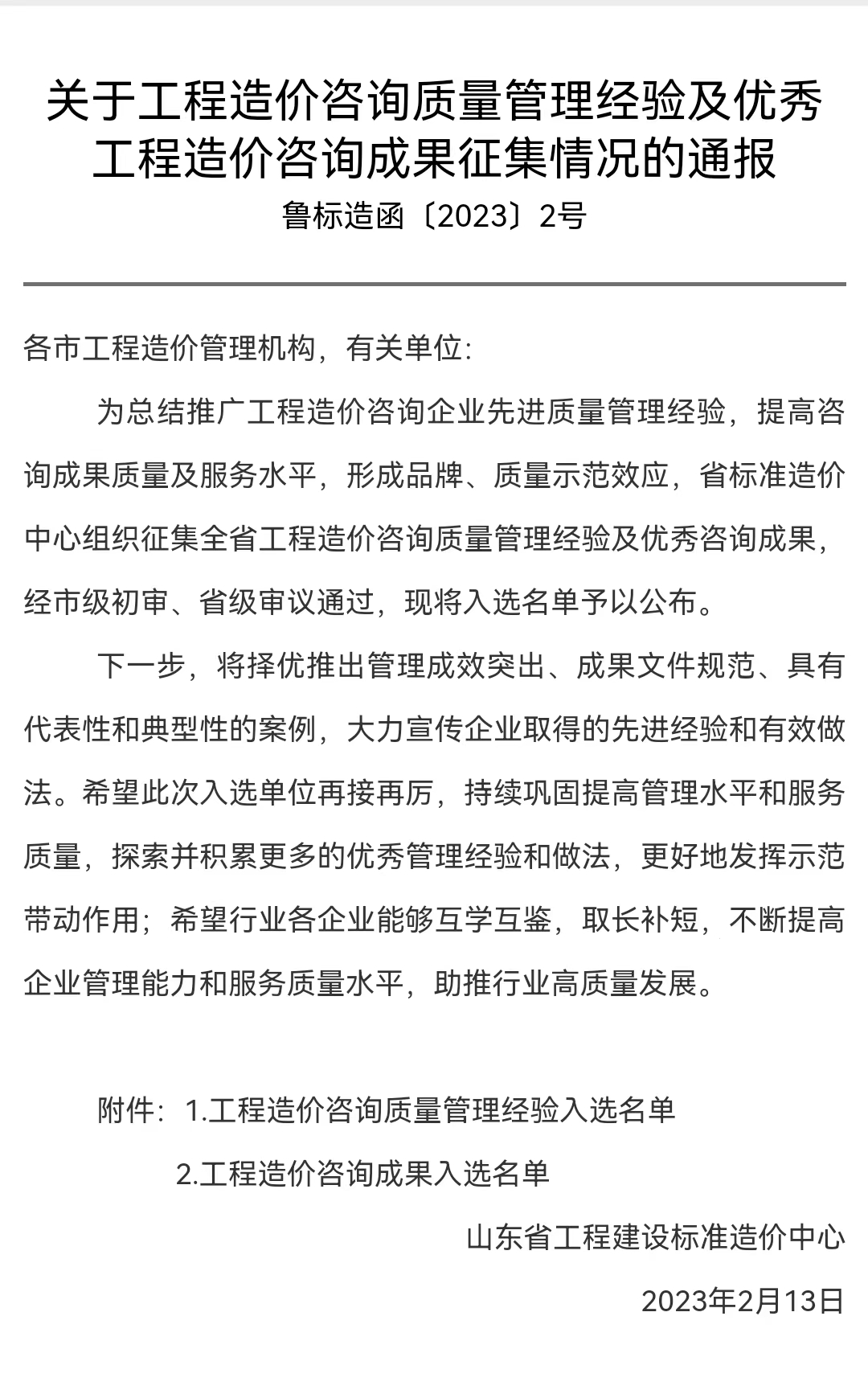 ?為總結(jié)推廣工程造價咨詢企業(yè)先進(jìn)質(zhì)量管理經(jīng)驗,提高咨詢成果質(zhì)量及服務(wù)水平,形成品牌、質(zhì)量示范效應(yīng),省標(biāo)準(zhǔn)造價中心組織征集全省工程造價咨詢質(zhì)量管理經(jīng)驗及優(yōu)秀咨詢成果,經(jīng)市級初審、省級審議通過,我公司入選山東省工程建設(shè)標(biāo)準(zhǔn)造價中心“工程造價咨詢成果”名單。